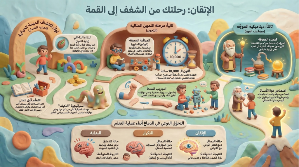 في عصر التعقيد الذي نعيشه، لم تعد المعرفة المتخصصة كافية، بل الإتقان هو القدرة على دمج المهارات المتعددة لتكوين رؤية فريدة. النجاح المهني ليس “ضربة حظ”، بل هو طقس يومي من الانضباط والتحول.