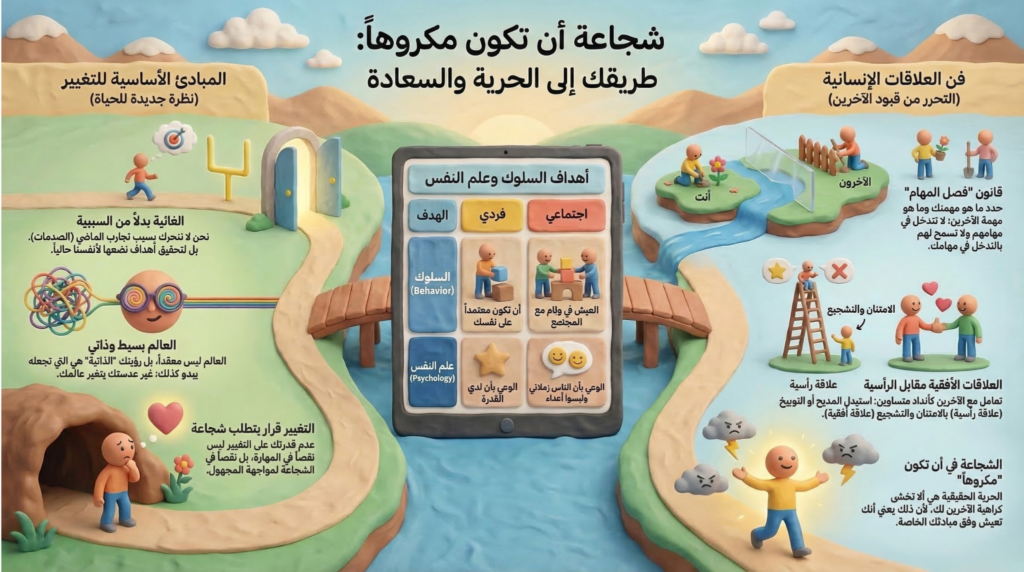 إن قررت امتلاك شجاعة أن تكون غير محبوب، فستكتشف أن السعادة ليست وجهة، بل هي حالة مساهمة تختارها في كل لحظة. ابدأ اليوم بتبني مبادئ علم النفس الحديثة التي أرساها ألفرد أدلر، وتذكر أن مفاتيح تطوير الذات وبناء علاقات صحية هي في يدك أنت، لأنك أنت من يملك “أوراق اللعب” في حياتك الخاصة. تخلص من “كذبة الحياة”، وعش “هنا والآن” بكامل حريتك.